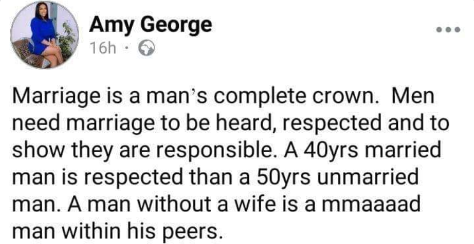 Her Facebook post which captioned “Marriage is a man’s complete crown. Men need marriage to be heard, respected and to show they are responsible. A 40yrs married man is respected than a 50yrs unmarried man. A man without a wife is a mmaaaad man within his peers.” has received several reactions online.