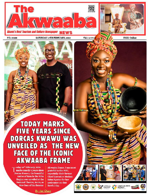 Today, February 14, 2026, marks a golden milestone in Ghana’s cultural history. Exactly five years ago, the halls of the National Theatre buzzed with excitement as Dorcas Kwawu, a daughter of Keta in the Volta Region, was officially unveiled as the new face of the iconic Akwaaba frame.