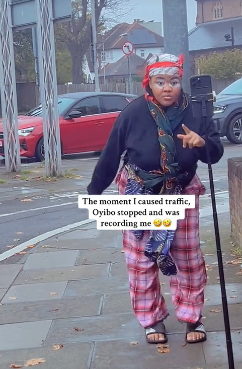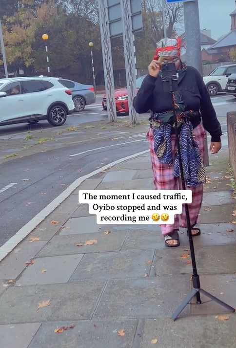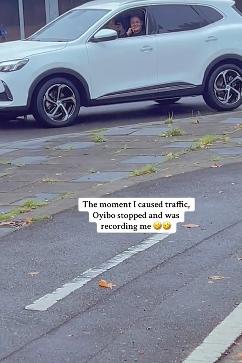 A Nigerian lady residing abroad drew attention while creating content on the street, prompting a Caucasian driver to stop and record her, causing a traffic jam.