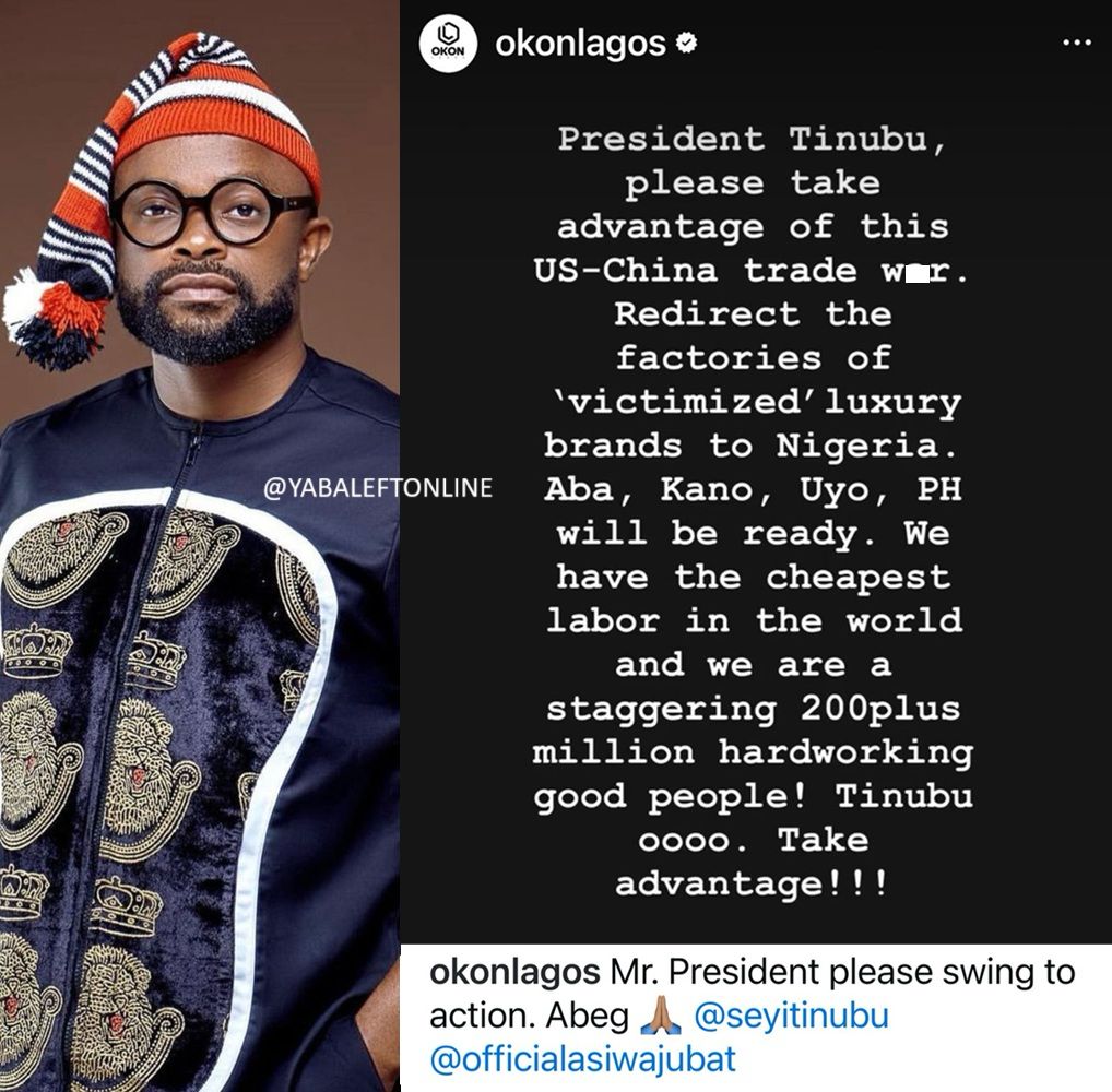 In an Instagram post, the actor appealed to Tinubu to seize the economic opportunity presented by the ongoing trade tensions between the United States and China.