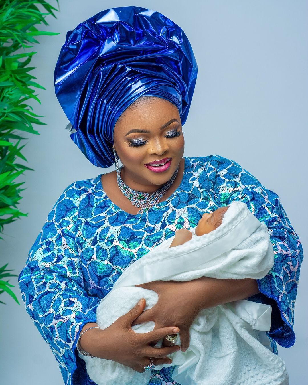 Amusa appeared stunning in the pictures with immense joy and pride, wearing a blue lace Iro and Buba attire with royal blue headgear as she cradles her baby.
