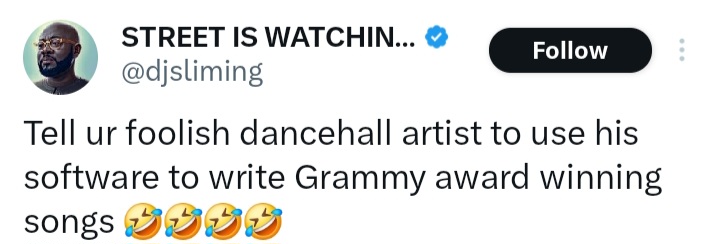 DJ Slim, who is also among those whose channels have reportedly been taken down, fired back by writing: “Tell ur foolish dancehall artist to use his software to write Grammy award winning songs.”