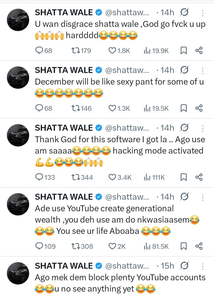 Following the fresh wave of terminations of some Ghanaian YouTube channels from the video sharing platform, musician Shatta Wale has dropped some messages on his X to suggest he had a hand it.