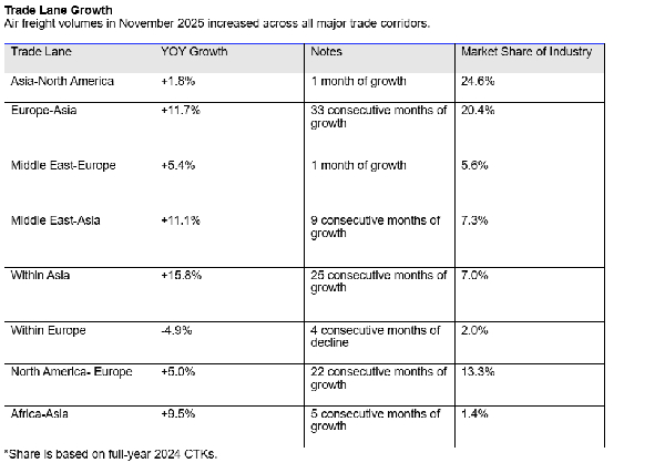 The International Air Transport Association (IATA) released data for November 2025 global air cargo markets showing: