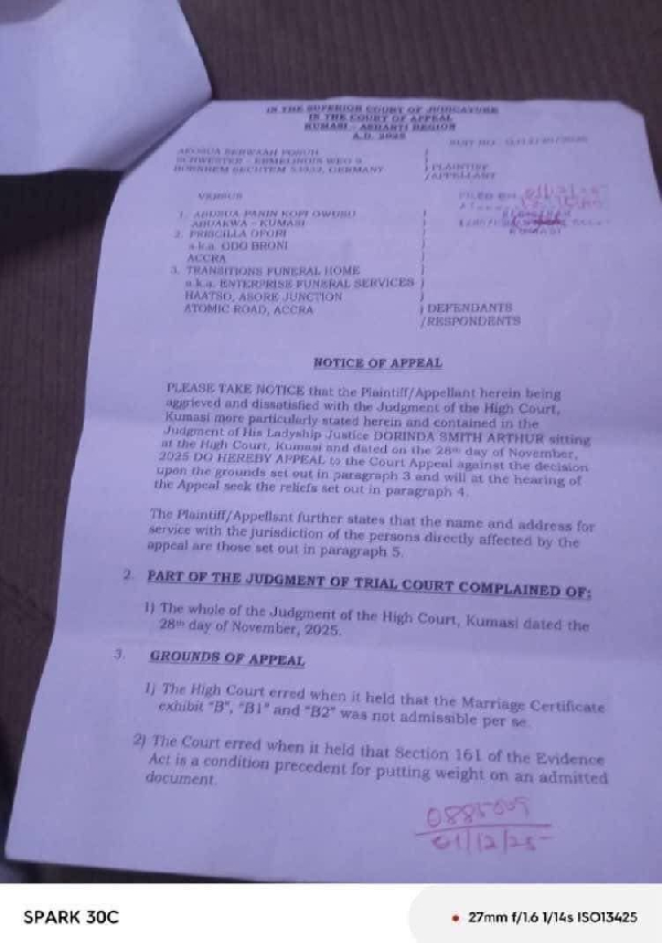 “Please take notice that the Plaintiff/Appellant herein being aggrieved and dissatisfied with the Judgment of the High Court, Kumasi more particularly stated herein and contained in the Judgment of His Ladyship Justice DORINDA SMITH ARTHUR sitting at the High Court, Kumasi and dated on the 28th day of November, 2025 DO HEREBY APPEAL to the Court of Appeal against the decision upon the grounds set out in paragraph 3 and will at the hearing of the Appeal seek the reliefs set out in paragraph 4,” part of the suit reads.