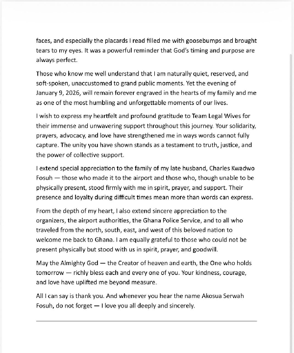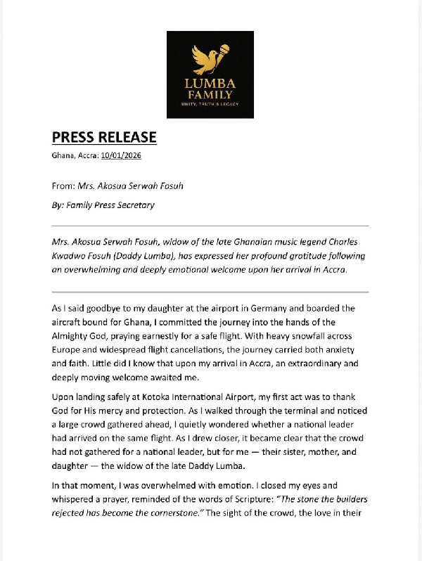 “Upon landing safely at Kotoka International Airport, my first act was to thank God for His mercy and protection. As I walked through the terminal and noticed a large crowd gathered ahead, I quietly wondered whether a national leader had arrived on the same flight. As I drew closer, it became clear that the crowd had not gathered for a national leader, but for me, their sister, mother, and daughter, the widow of the late Daddy Lumba,” part of the statement read.