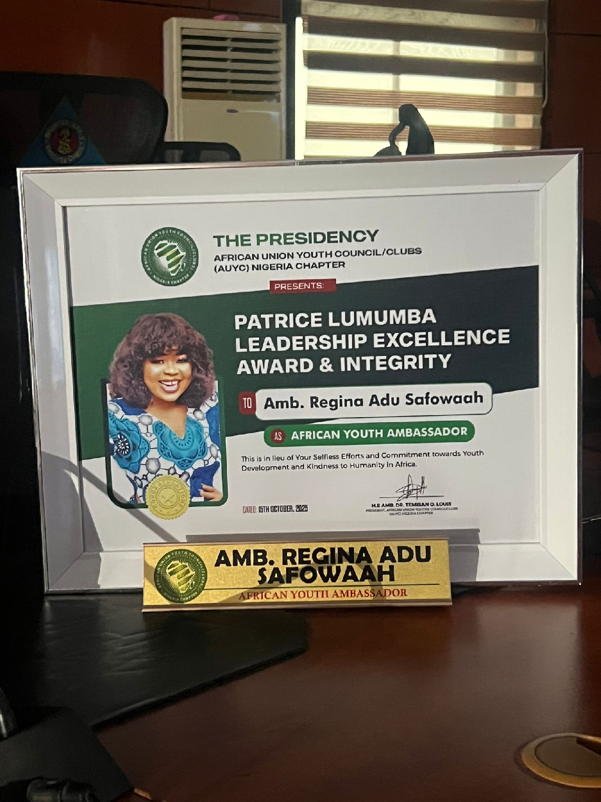 Ghanaian media personality, entrepreneur, and humanitarian Ambassador Regina Adu Safowaah has once again made Ghana proud as she was officially inducted as an African Youth Ambassador by the African Union Youth Council (AUYC), Nigeria Chapter in Abuja, Nigeria.