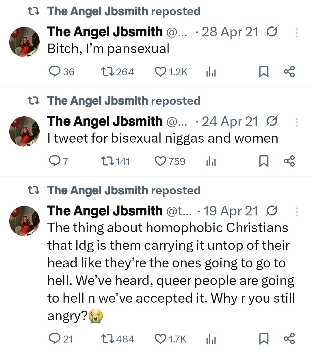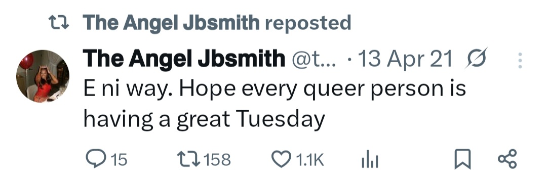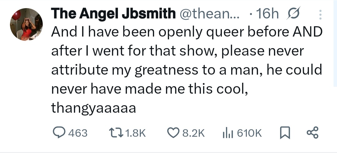 To back up her point, Angel reposted a string of her own tweets from April 2021, well before she appeared on BBNaija, in which she had already identified openly as pansexual and expressed her support for the queer community without apology. One post from April 28, 2021 read simply: “Bitch, I’m pansexual.” Another from April 19 of the same year pushed back at homophobic Christians with the kind of unbothered energy she has become known for online.