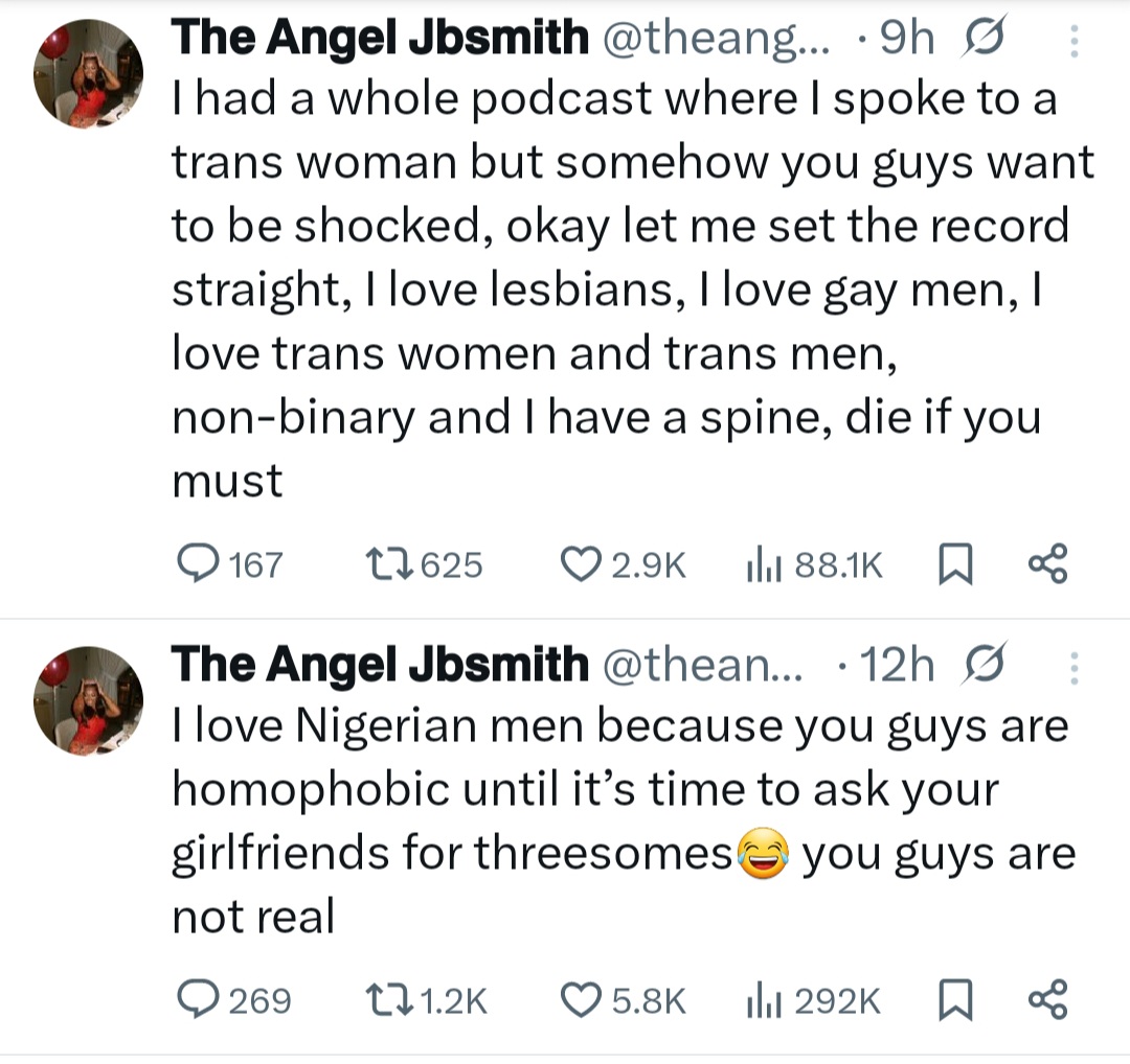 She also took a pointed swipe at Nigerian men who she says perform outrage at homosexuality in public while privately requesting threesomes involving another woman with their girlfriends. “I love Nigerian men because you guys are homophobic until it’s time to ask your girlfriends for threesomes. You guys are not real,” she wrote, a line that has since become one of the most shared parts of the entire thread.