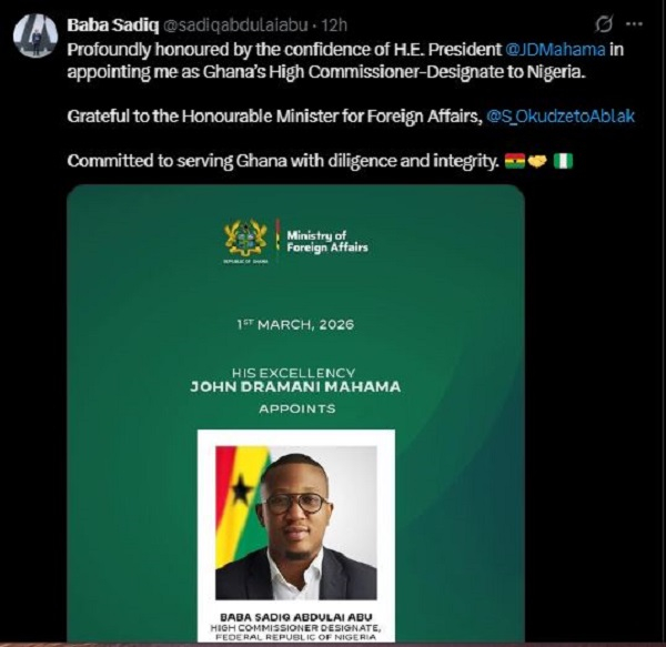 In a post shared on X on March 1, 2026, Baba Sadiq said he is honoured by the confidence reposed in him by John Dramani Mahama in appointing him to represent Ghana in Nigeria.