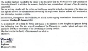 In the letter, it was revealed that at about 8:20 pm on Wednesday a member of the staff and some students, while headed towards one of the University’s hostels, had encountered the victim running towards the staff quarter.