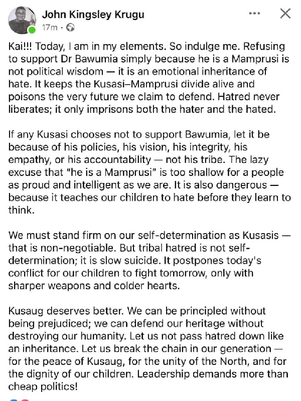 “Refusing to support Dr. Bawumia simply because he is a Mamprusi is not political wisdom, it is an emotional inheritance of hate. It keeps the Kusasi–Mamprusi divide alive and poisons the very future we claim to defend,” Dr Krugu wrote.