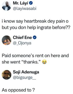 Reacting to his post an X user shared her experience with such an individual. She mentioned had helped the person pay their rent but only received a simple thanks.