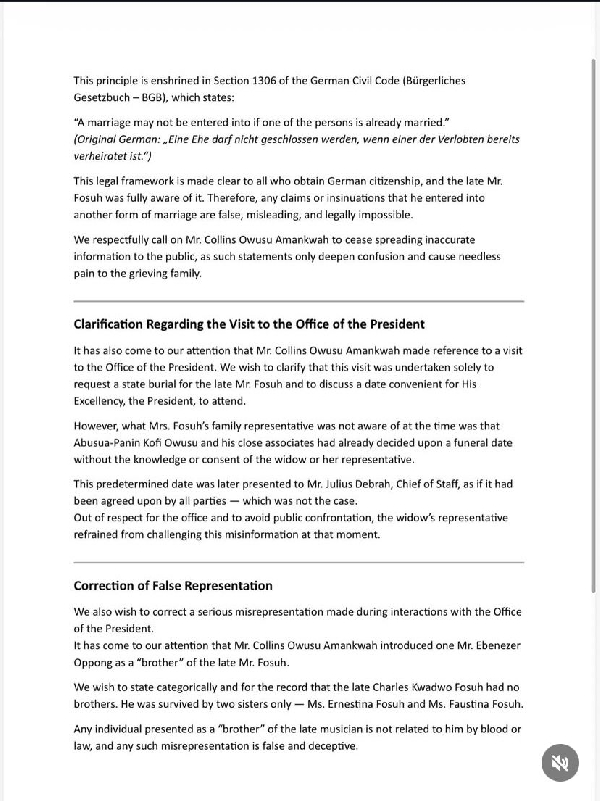 “It has also come to our attention that Mr. Collins Owusu Amankwah made reference to a visit to the Office of the President. We wish to clarify that this visit was undertaken solely to request a state burial for the late Mr. Fosuh and to discuss a date convenient for His Excellency, the President, to attend.