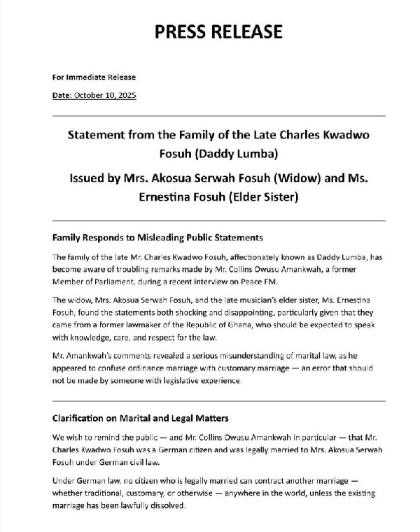 In a detailed statement dated October 10, 2025, and signed by the family secretary on behalf of Lumba’s elder sister, Ernestina Fosu, and his German-based wife, Akosua Serwaa Fosu, the two women described comments made by Collins Owusu Amankwah during a Peace FM interview on October 9, 2025, as “troubling,” especially given his position as a former lawmaker and a member of the funeral committee.