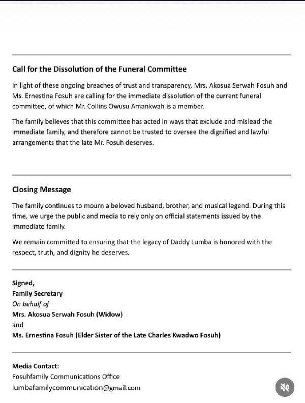 “In light of these ongoing breaches of trust and transparency, Mrs. Akosua Serwaa Fosu and Ms. Ernestina Fosu are calling for the immediate dissolution of the current funeral committee of which Mr. Collins Owusu Amankwah is a member,” the statement read.