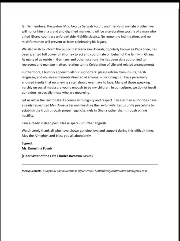 The Celebration of Life is scheduled for March 28 and 29, 2026, in Accra. Fosuh said she will join her uncle, Yaw Opoku, other family members, the widow Mrs. Akosua Serwah Fosuh, and close associates of the late musician to organise what she described as a grand and dignified tribute.