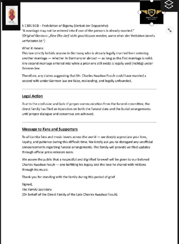 It further reminded the public that the late artiste was legally married to Akosua Serwaa on December 23, 2004, in Bornheim, Germany. Under German law, they added, bigamy is prohibited.