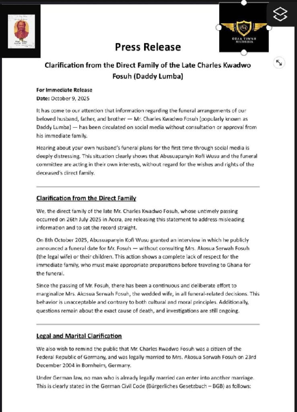In a related development, the “direct family” of the late musician also issued a press statement confirming that legal steps have been taken to halt the funeral until proper consultations are held. They claimed that since Daddy Lumba’s death on July 26, 2025, there has been a “continuous and deliberate effort to marginalise” his wife in all funeral-related discussions.