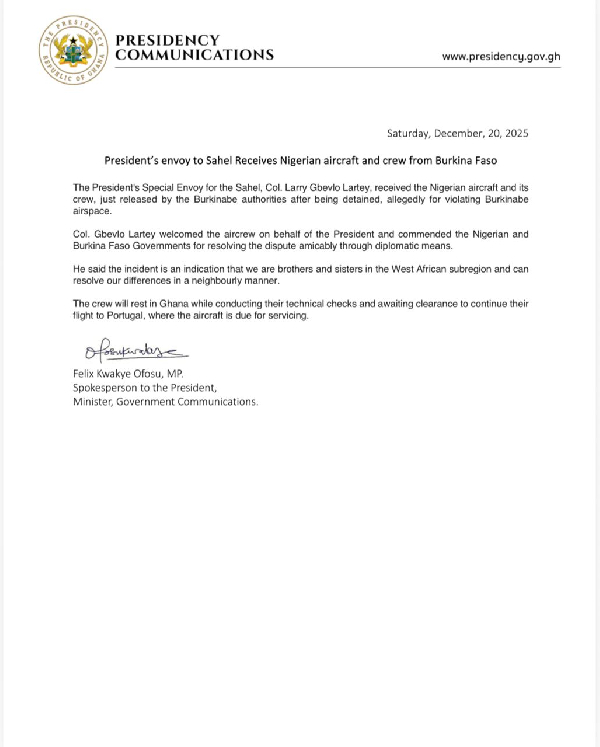 “Col Gbevlo Lartey welcomed the aircrew on behalf of the President and commended the Nigerian and Burkina Faso Governments for resolving the dispute amicably through diplomatic means,” portions of the statement read.