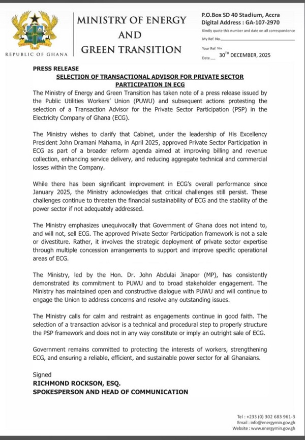 The Ministry of Energy and Green Transition has responded to concerns raised by the Public Utilities Workers’ Union (PUWU) over the selection of a transactional advisor for private sector participation (PSP) in the Electricity Company of Ghana (ECG), assuring the public that ECG is not being sold.