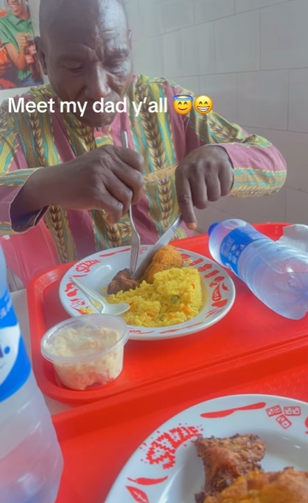 A heartwarming moment unfolded as a Nigerian dad experienced difficulty using cutlery at a restaurant after being treated to a special rice and chicken meal by his thoughtful son.