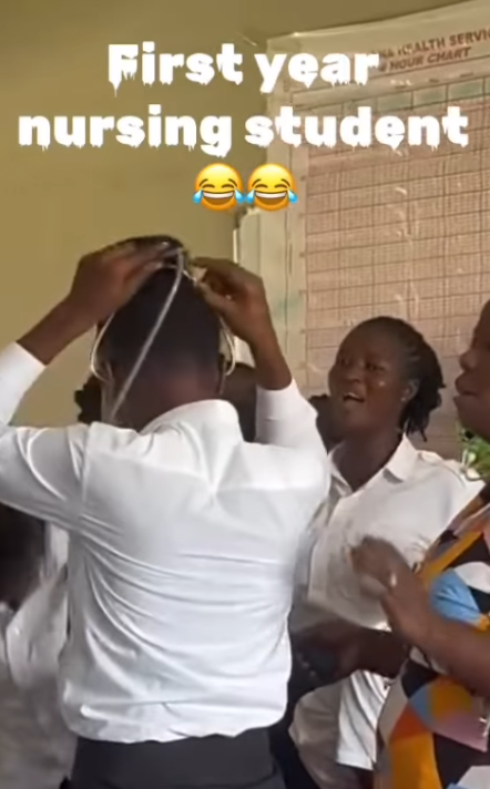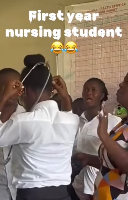 A first-year nursing student accidentally wore her stethoscope incorrectly during a training session, sparking amusement among her classmates.