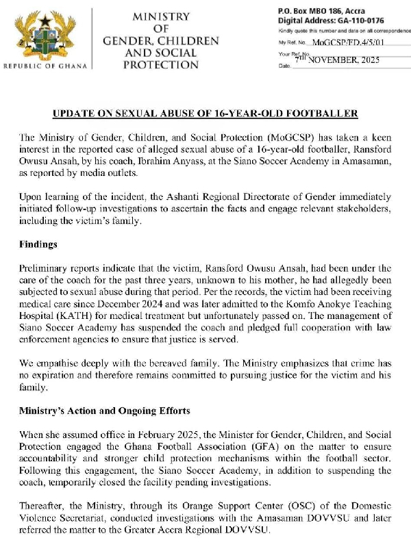 “When she assumed office in February 2025, the Minister for Gender, Children, and Social Protection engaged the Ghana Football Association (GFA) on the matter to ensure accountability and stronger child protection mechanisms within the football sector. Following this engagement, Siano Soccer Academy, in addition to suspending the coach, temporarily closed the facility pending investigations.