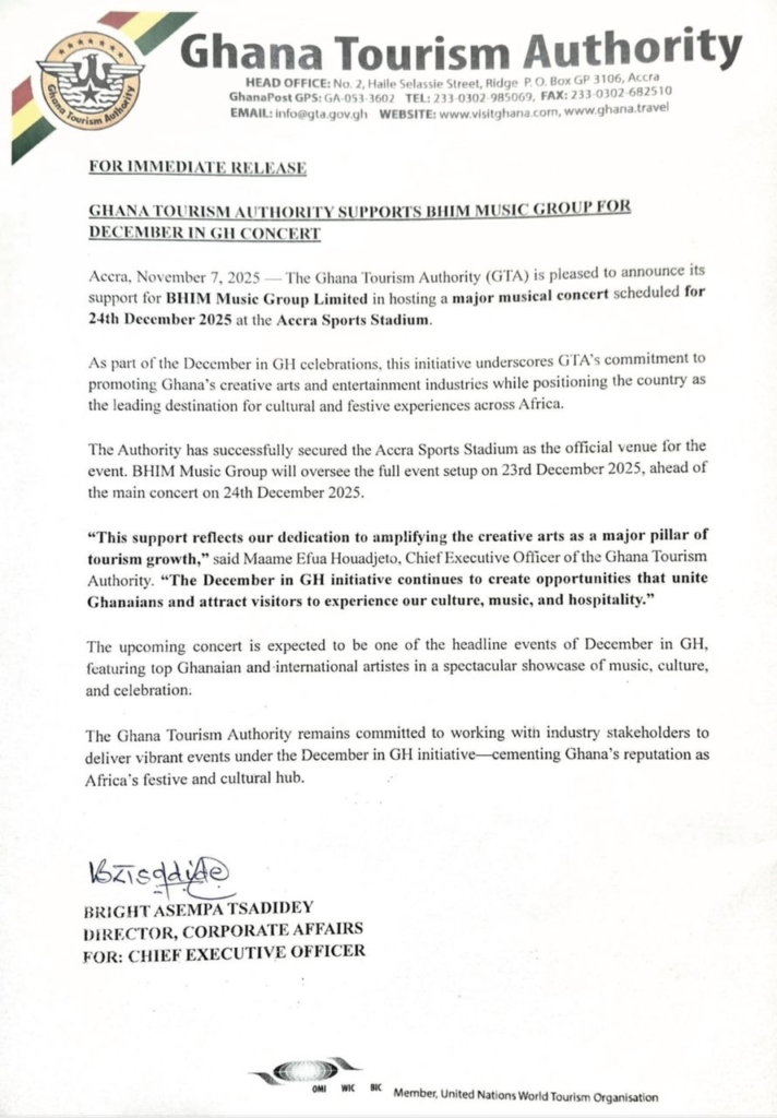 The Ghana Tourism Authority (GTA) has joined forces with Burniton Music Group Limited to stage the 2025 edition of the Bhim Festival, now set for December 24 at the Accra Sports Stadium.
