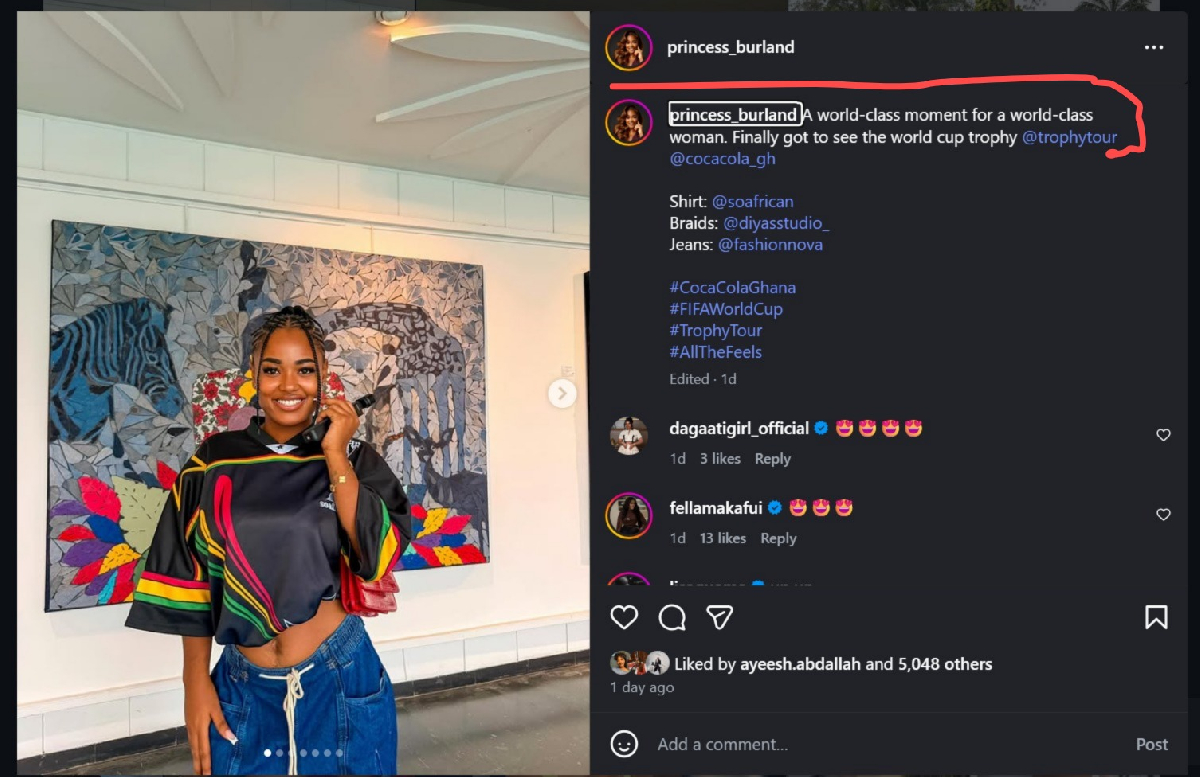 The Ghanaian influencers reflected this emotion in their videos. Lisaquama promised to speak only French while in Côte d’Ivoire. Kojo Junior was seen taking close-up pictures with the trophy on stage, expressing his excitement. Princess Burland shared her delight, noting how this experience was a world-class moment for someone as accomplished as herself, and expressed her joy in finally seeing the World Cup trophy.