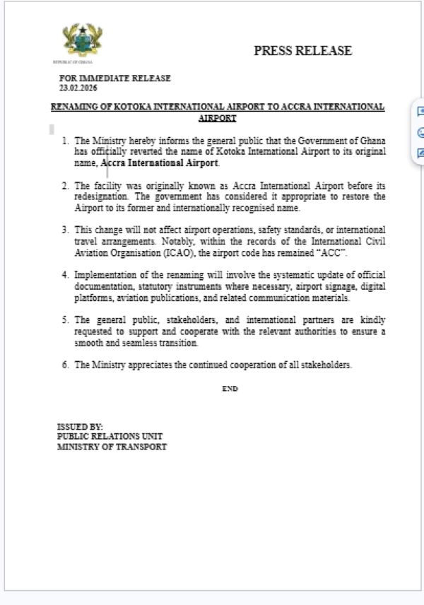 The Ministry of Transport has officially announced the reversion of Kotoka International Airport to its original name, Accra International Airport.