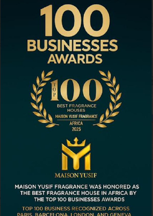 Maison Yusif Fragrance, the fast-rising luxury perfume house founded by Ghanaian perfumer Yusif Meizongo Jnr, has been honored as the Best Fragrance House in Africa by the prestigious Top 100 Businesses Awards, an international recognition body with visibility across Paris, Barcelona, London, and Geneva.