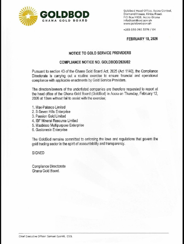 Their directors and owners were directed to meet with GOLDBOD’s Compliance Directorate on Thursday, 12 February 2026, at 10 a.m., and were cautioned not to “fail to assist with the exercise”.