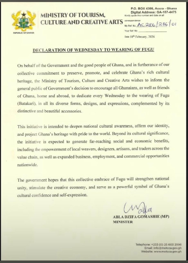 The Government of Ghana, through the Ministry of Tourism, Culture and Creative Arts has dedicated Wednesdays to the wearing of Fugu, also known as Batakari.