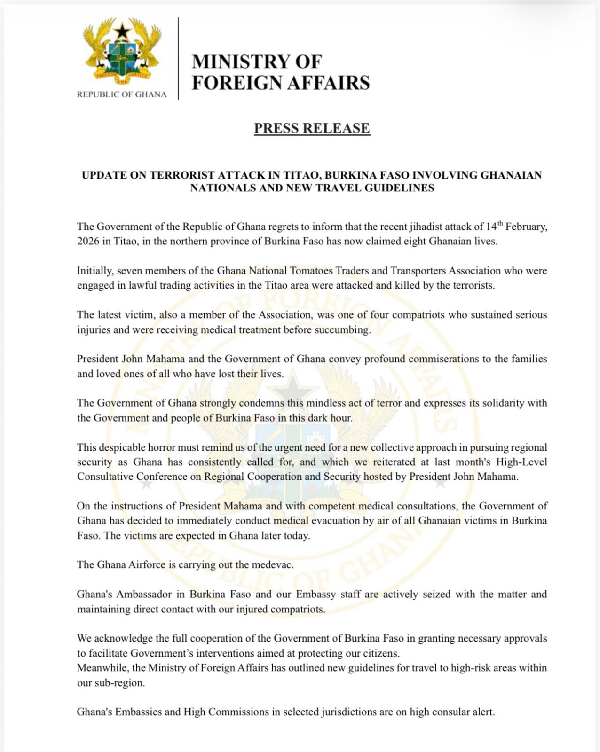 “The Government of the Republic of Ghana regrets to inform that the recent jihadist attack of 14th February, 2026, in Titao, in the northern province of Burkina Faso, has now claimed eight Ghanaian lives,” the statement said.