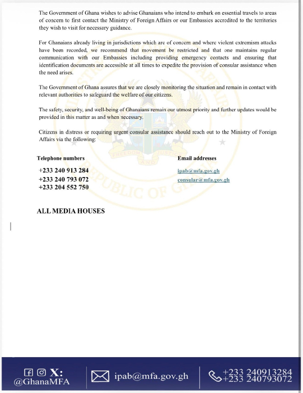 “The safety, security, and well-being of Ghanaians remain our utmost priority, and further updates would be provided in this matter as and when necessary,” the Ministry assured.