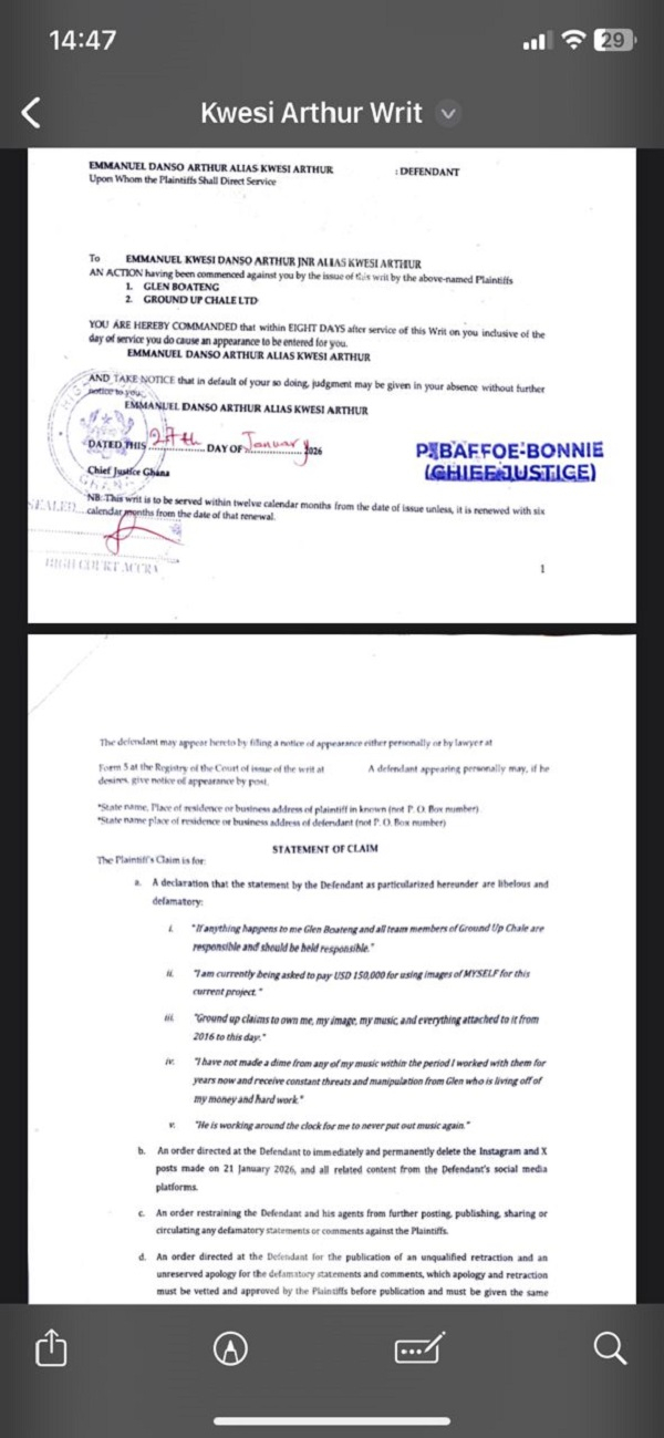 In a writ of summons dated January 27, 2026, Kwesi Arthur is accused of libel, with the founder of the creative collective and Ground Up Chale seeking more than GH¢10 million in damages over comments the rapper made in a social media post.