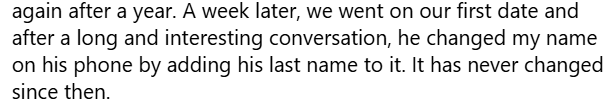 “That spiralled into a conversation with him proposing to see me again after a year. A week later, we went on our first date and after a long and interesting conversation, he changed my name on his phone by adding his last name to it. It has never changed since then.”