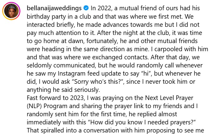 Later in 2023, she shared a prayer link with her friends and randomly sent it to him, to which he instantly replied, asking how she knew he needed prayers. The prayer link resulted in a date and a committed relationship.