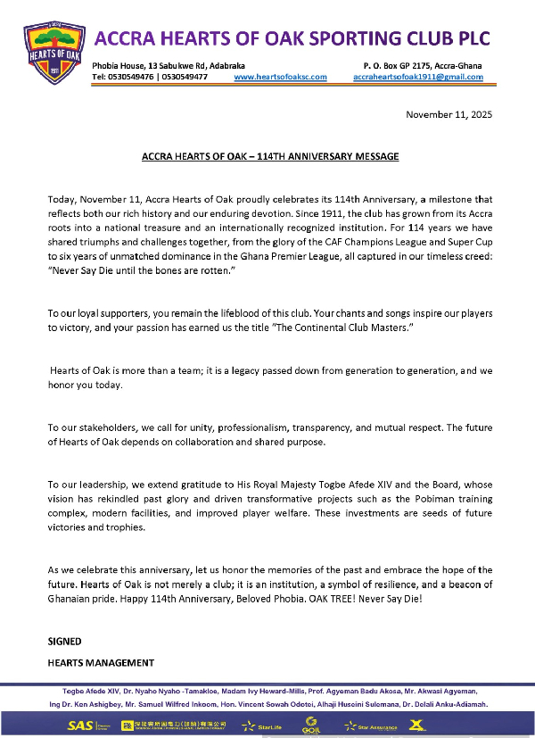 “Today, November 11, Accra Hearts of Oak proudly celebrates its 114th Anniversary, a milestone that reflects both our rich history and our enduring devotion. Since 1911, the club has grown from its Accra roots into a national treasure and an internationally recognized institution. For 114 years we have shared triumphs and challenges together, from the glory of the CAF Champions League and Super Cup to six years of unmatched dominance in the Ghana Premier League, all captured in our timeless creed: