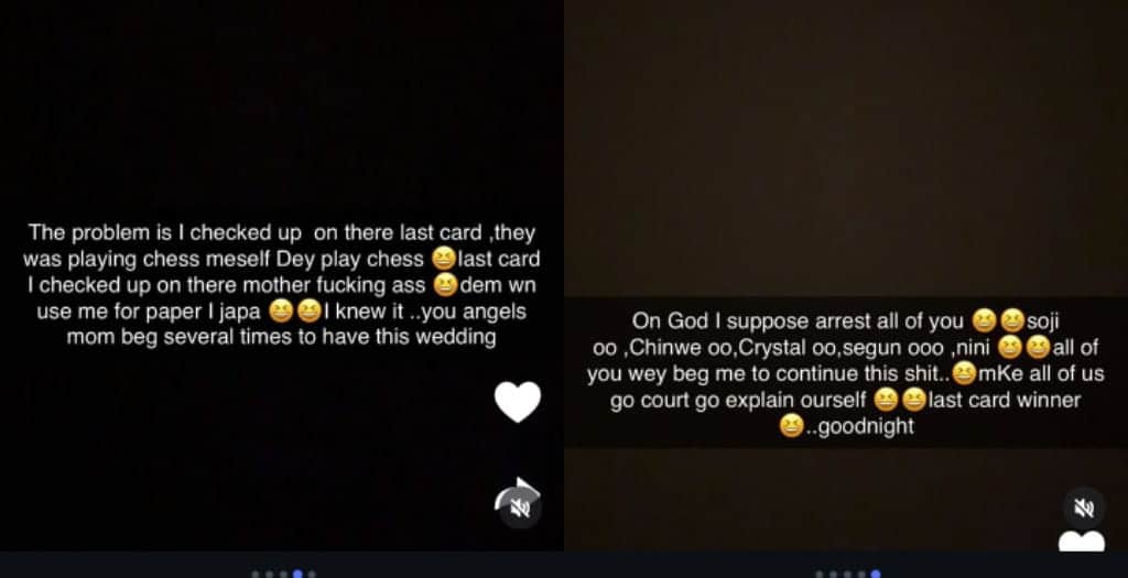 She named friends who had encouraged her to go through with the wedding and threatened to see them all in court. “Soji, Chinwe, Crystal, Segun, all of you wey beg me to continue this shit. All of us go to court to explain ourselves,” she wrote.