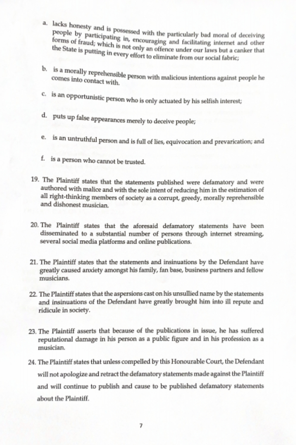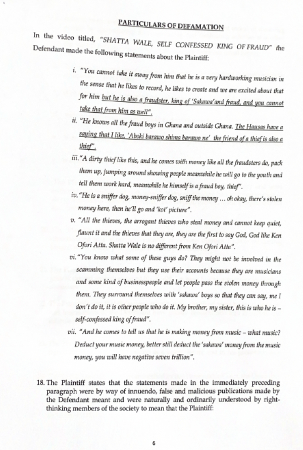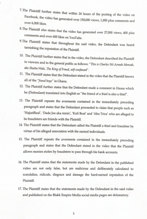 “The Plaintiff repeats the averments contained in the immediately preceding paragraph and states that the Defendant proceeded to claim that people such as ‘Hajia4Real’, ‘Dada Joe aka remix’, ‘Kofi Boat’ and ‘Abu Trica’, who are alleged to be fraudsters, are friends with the Plaintiff. The Plaintiff states that the Defendant called the Plaintiff a thief and a fraudster by virtue of his alleged association with the named individuals.