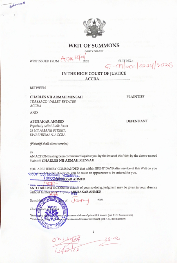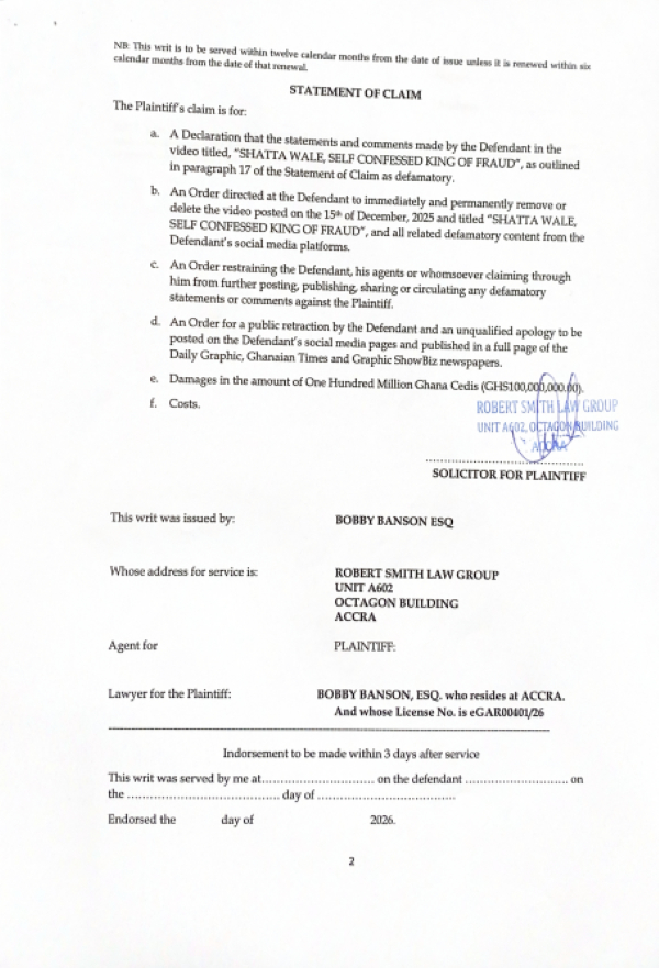 According to the suit, on Monday, 15th December 2025, Blakk Rasta, in his video titled “Shatta Wale, Self Confessed King of Fraud,” shared on social media, accused Shatta Wale of being associated with fraud and “knows all of the ‘fraud boys’ in Ghana.”