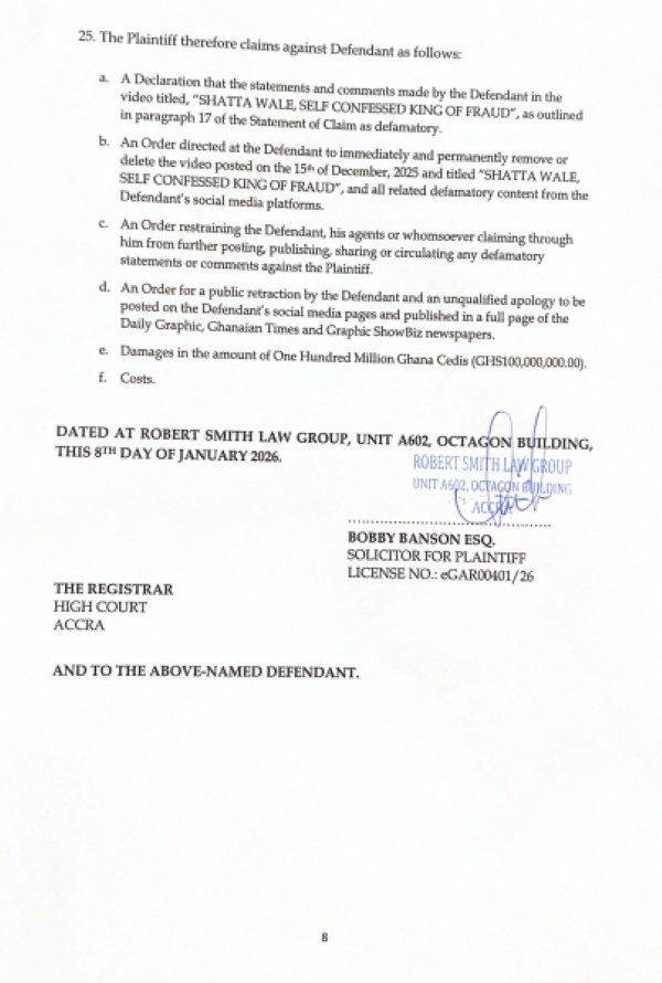 Lastly, Shatta Wale wants an amount to the tune of One Hundred Million Ghana cedis (GH¢100,000,000) as well as legal costs.