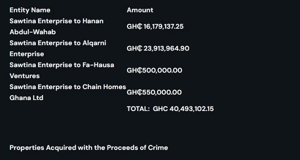 Five-bedroom house bought from Chain Homes Limited between February 2019 and December 2020 at a cost of $1,625,000. Of this amount, GH¢5,758,165.00 (equivalent to $230,841.00) was paid directly from the accounts of the investigated entities. The balance was paid in cash to Chain Homes by the couple;