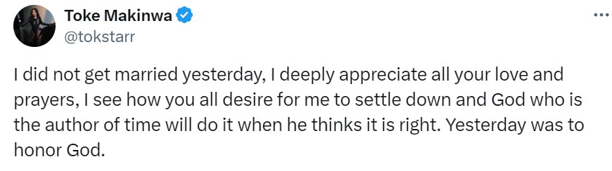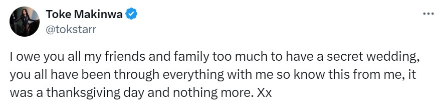 Recall that numerous reports claimed that Toke Makinwa tied the knot secretly after photos from her 40th birthday Thanksgiving ceremony went viral.