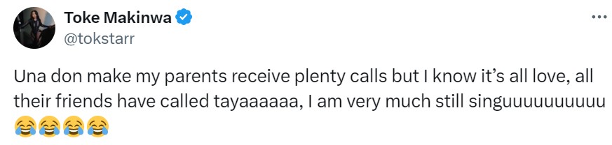 “I did not get married yesterday, I deeply appreciate all your love and prayers, I see how you all desire for me to settle down and God who is the author of time will do it when he thinks it is right. Yesterday was to honor God. Una don make my parents receive plenty calls but I know it’s all love, all their friends have called tayaaaaaa, I am very much still singuuuuuuuuuu”