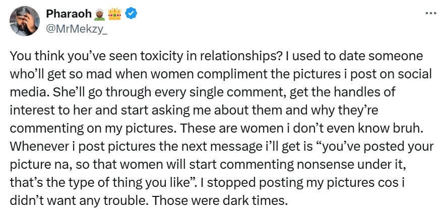 “You think you’ve seen toxicity in relationships? I used to date someone who’ll get so mad when women compliment the pictures i post on social media. She’ll go through every single comment, get the handles of interest to her and start asking me about them and why they’re commenting on my pictures. These are women i don’t even know bruh. Whenever i post pictures the next message i’ll get is “you’ve posted your picture na, so that women will start commenting nonsense under it, that’s the type of thing you like”. I stopped posting my pictures cos i didn’t want any trouble. Those were dark times”.