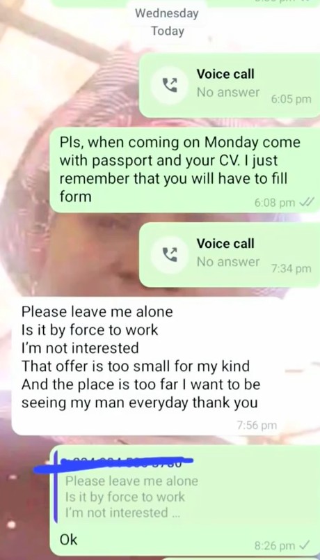 The job seeker turned down the offer because she wanted to see her man every day. She concluded that the employment location was far from her home, and the salary was below her standards.