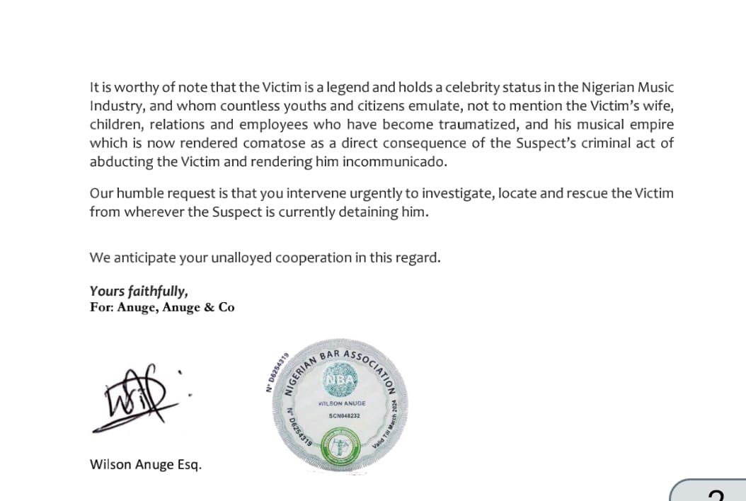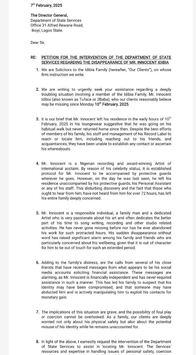 “It is our brief that Mr. Innocent left his residence in the early hours of 10th February 2025 in his loungewear suggestive that he was hoping on his habitual walk but never returned home since then. Despite the best efforts of his members of his family, his staff and management of his Record label to reach or locate him, including reaching out to his friends and acquaintances; they have been unable to establish any contact or ascertain his whereabouts.